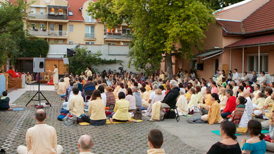 Az ahsram udvarán tartott szatszangot a világhírű jógamester a Debrecenben rendezett 3 napos szeminárium alkalmával.